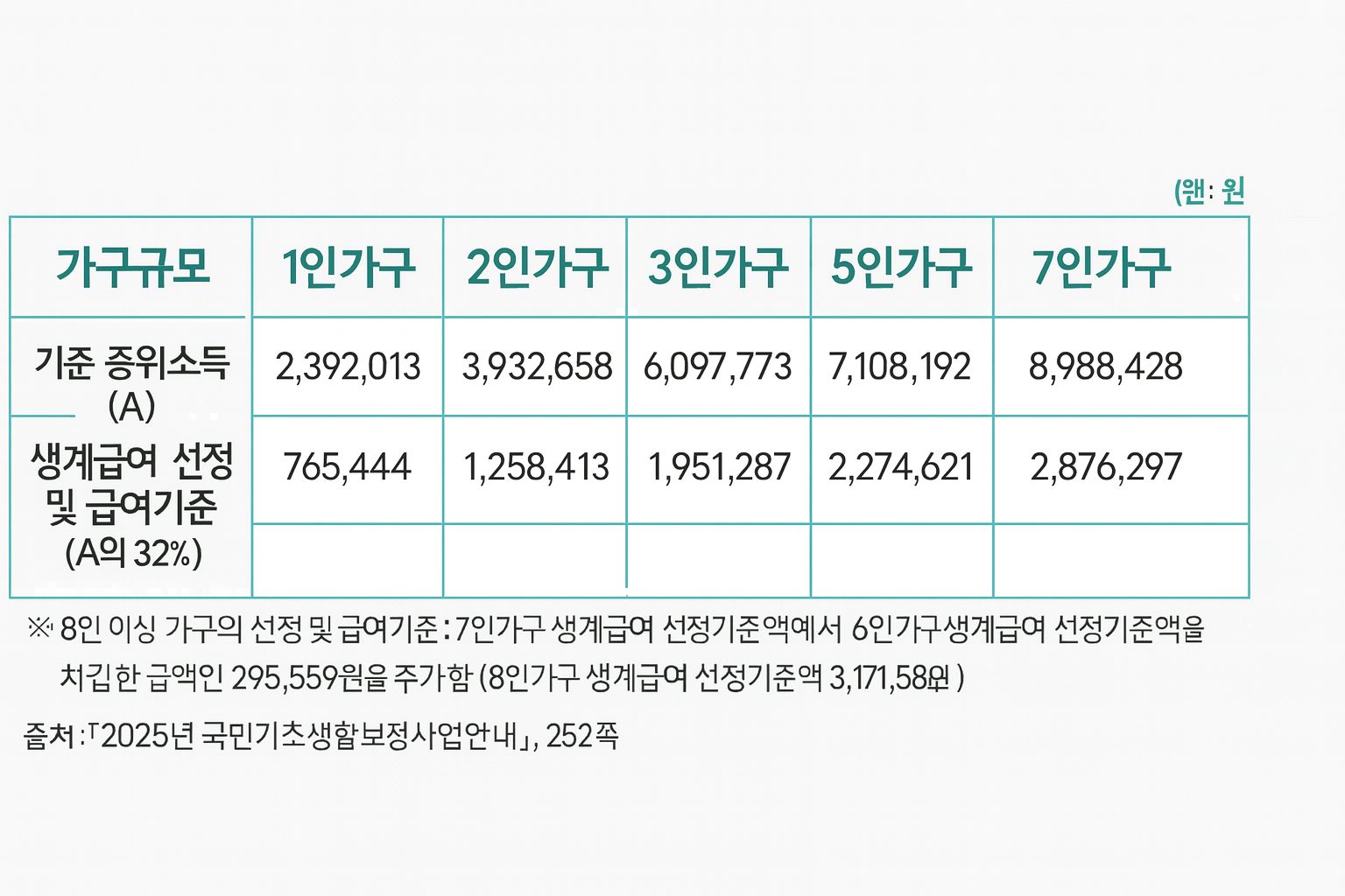 - ③ 선정기준 충족: 가구원 수별 “2025 생계급여 기준액(중위 32%)” 이하인지 확인.